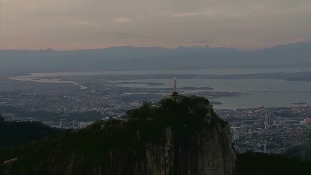 > Zoom out from Christ Statue overlooking Rio de Janeiro, Brazil, Cineflex Aerial