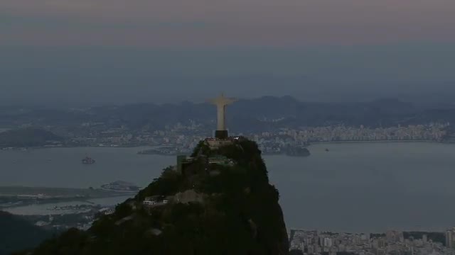 > Zoom in to Christ the Redeemer statue at dusk, Rio de Janeiro, Brazil, Cineflex Aerial