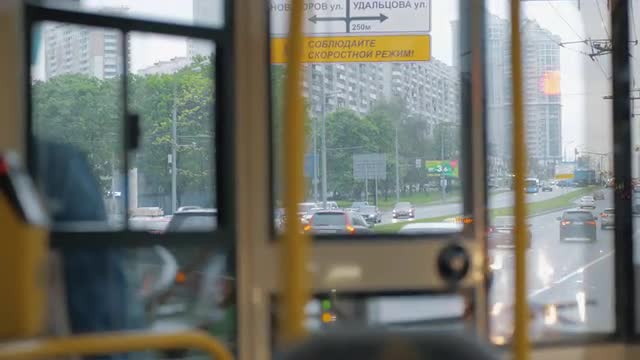 1033679 - View through bus windscreen to car traffic on the road, Moscow