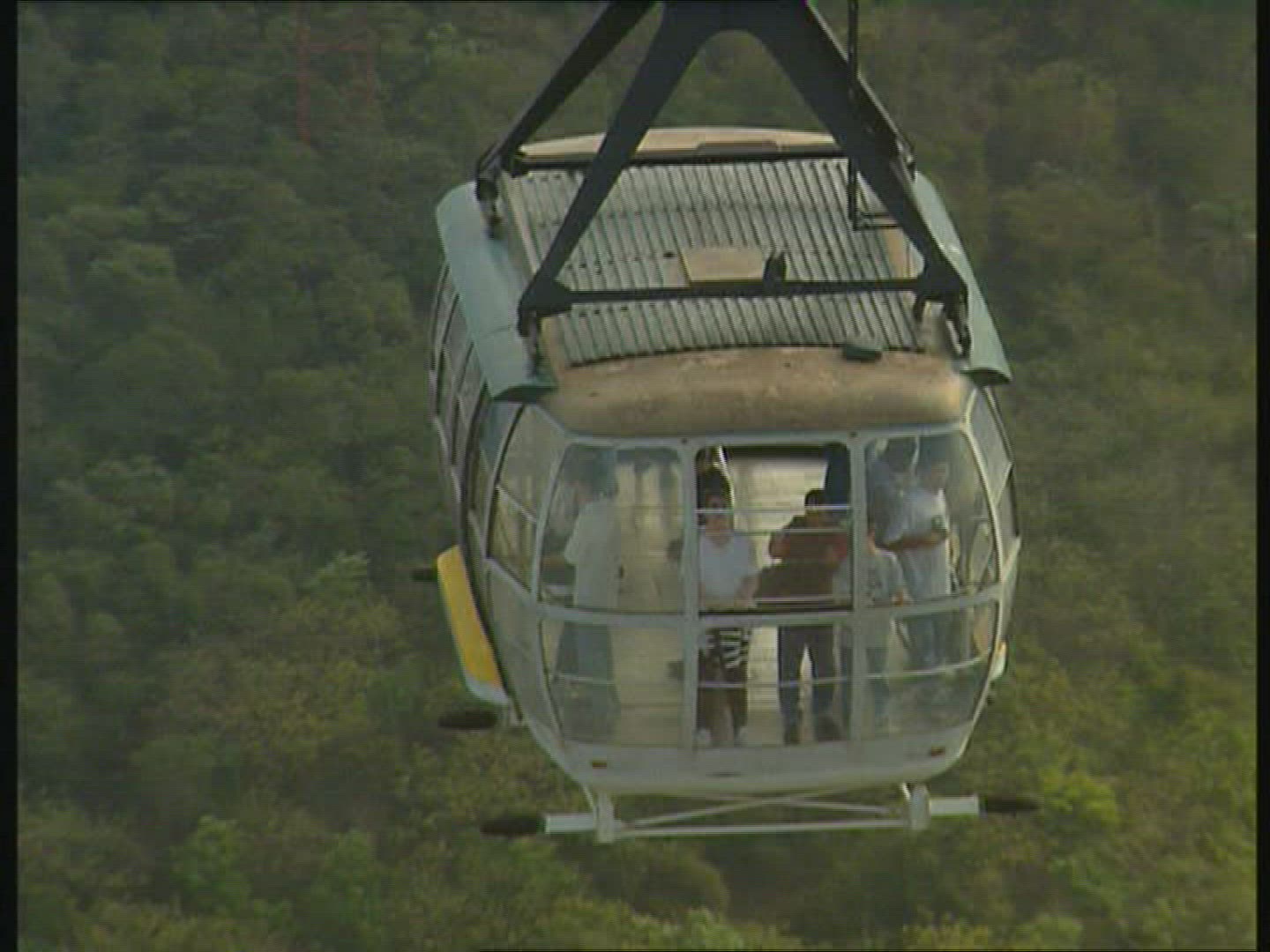 > Aerial shot of gondola over favela, Rio de Janeiro, Brazil