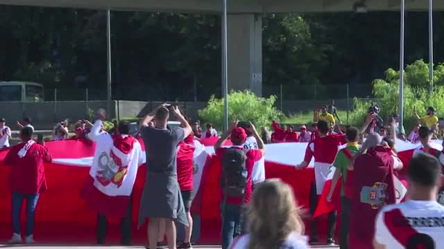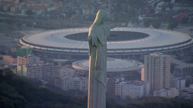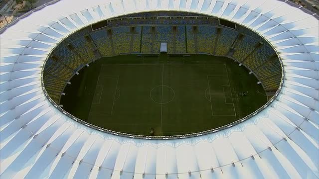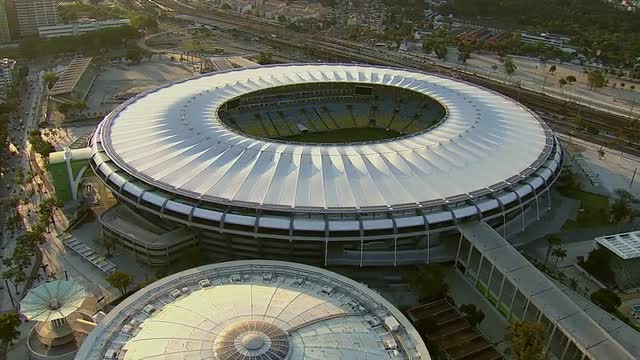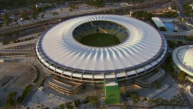 > Aerial view of Maracana Stadium and city lights at night, Rio De Janeiro, Brazil