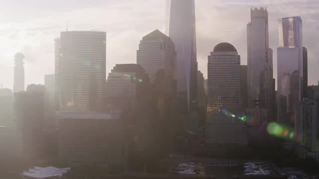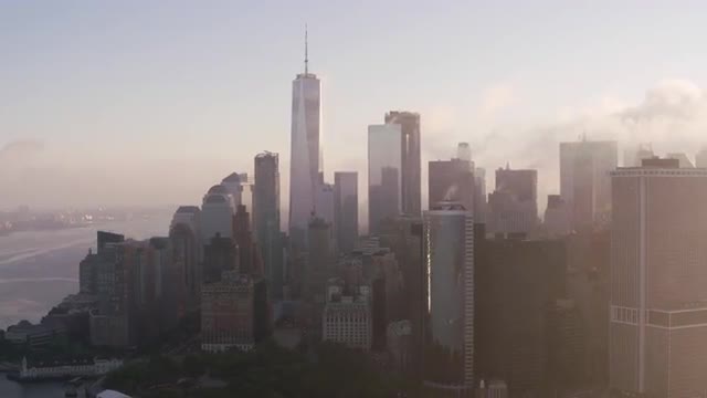 999160 - New York City circa-2017, Tracking by lower Manhattan buildings with low clouds and early morning su