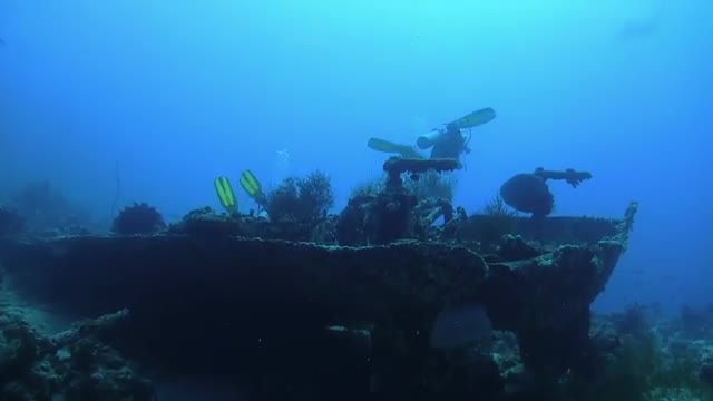 316181 - Group of Divers Swims over Ship Wreck, underwater scene