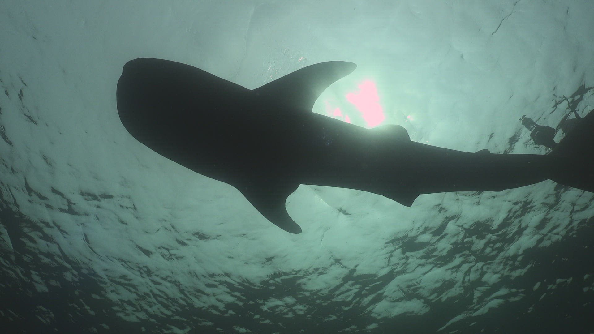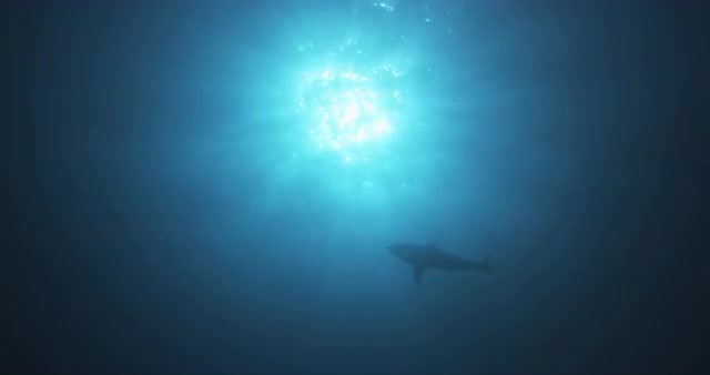 A shark circles, camera looking at light from underwater.
