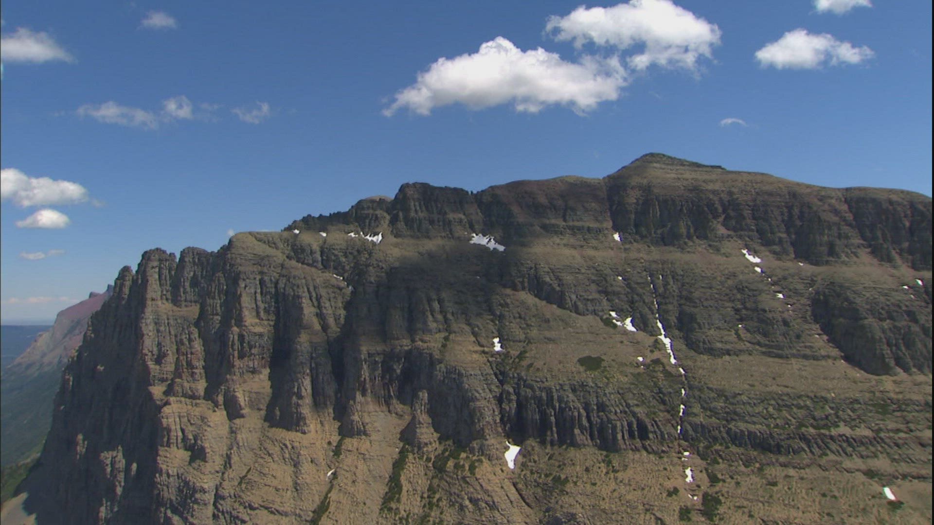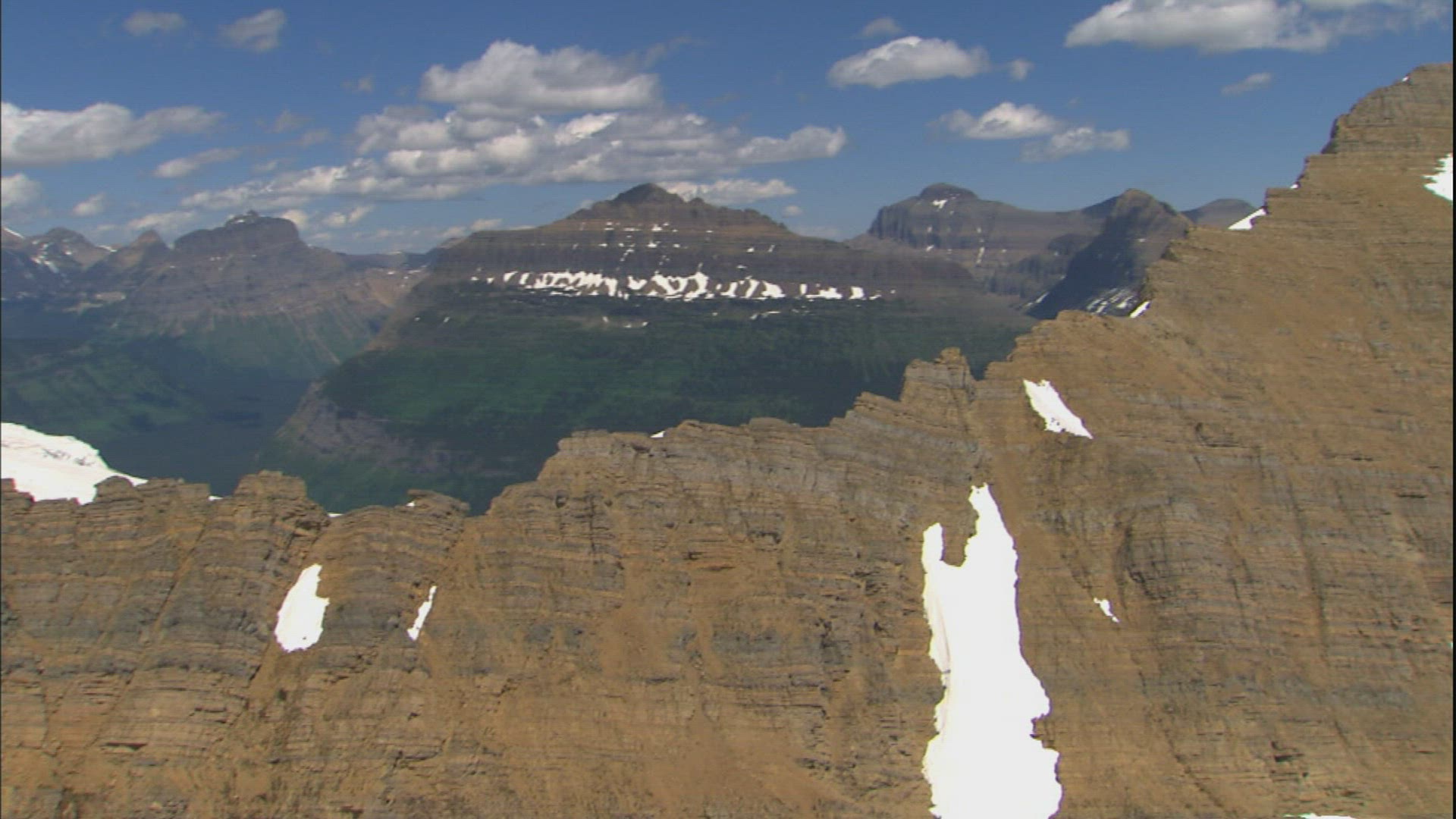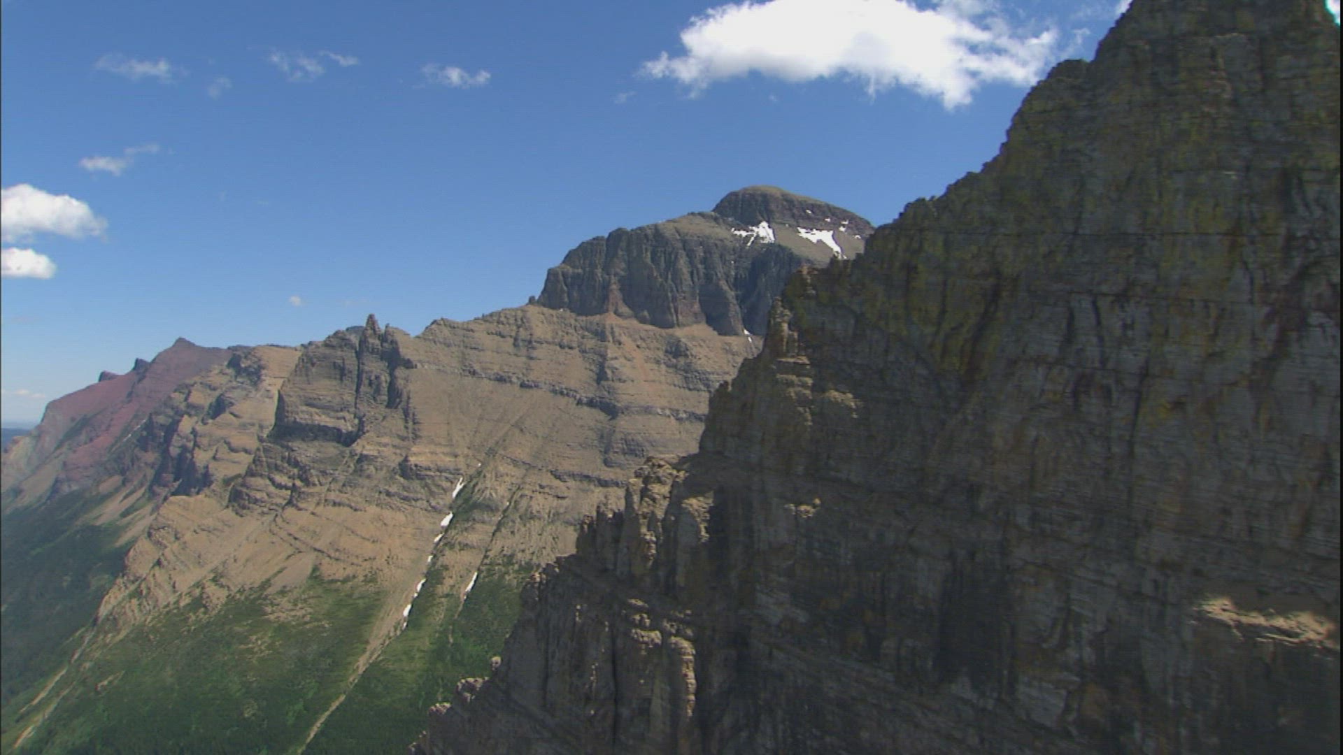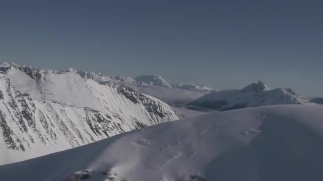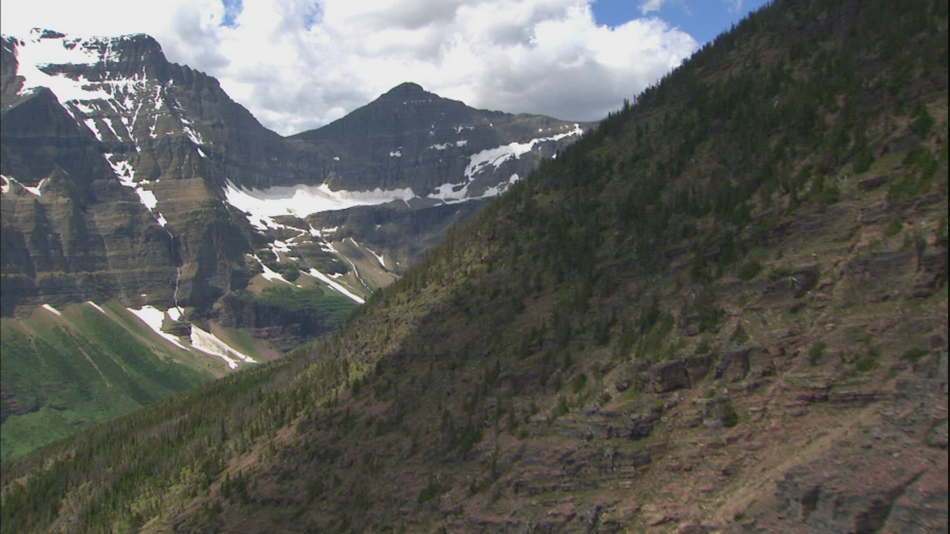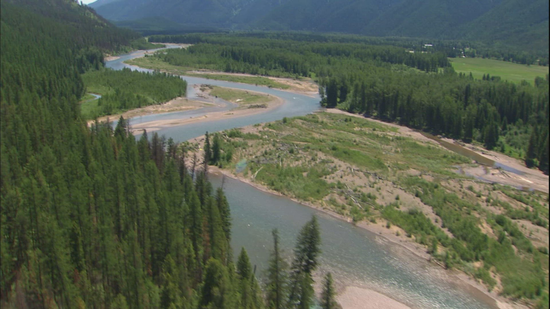 From a helicopter, the camera focuses in on a mountainous lake that is surrounded by trees.