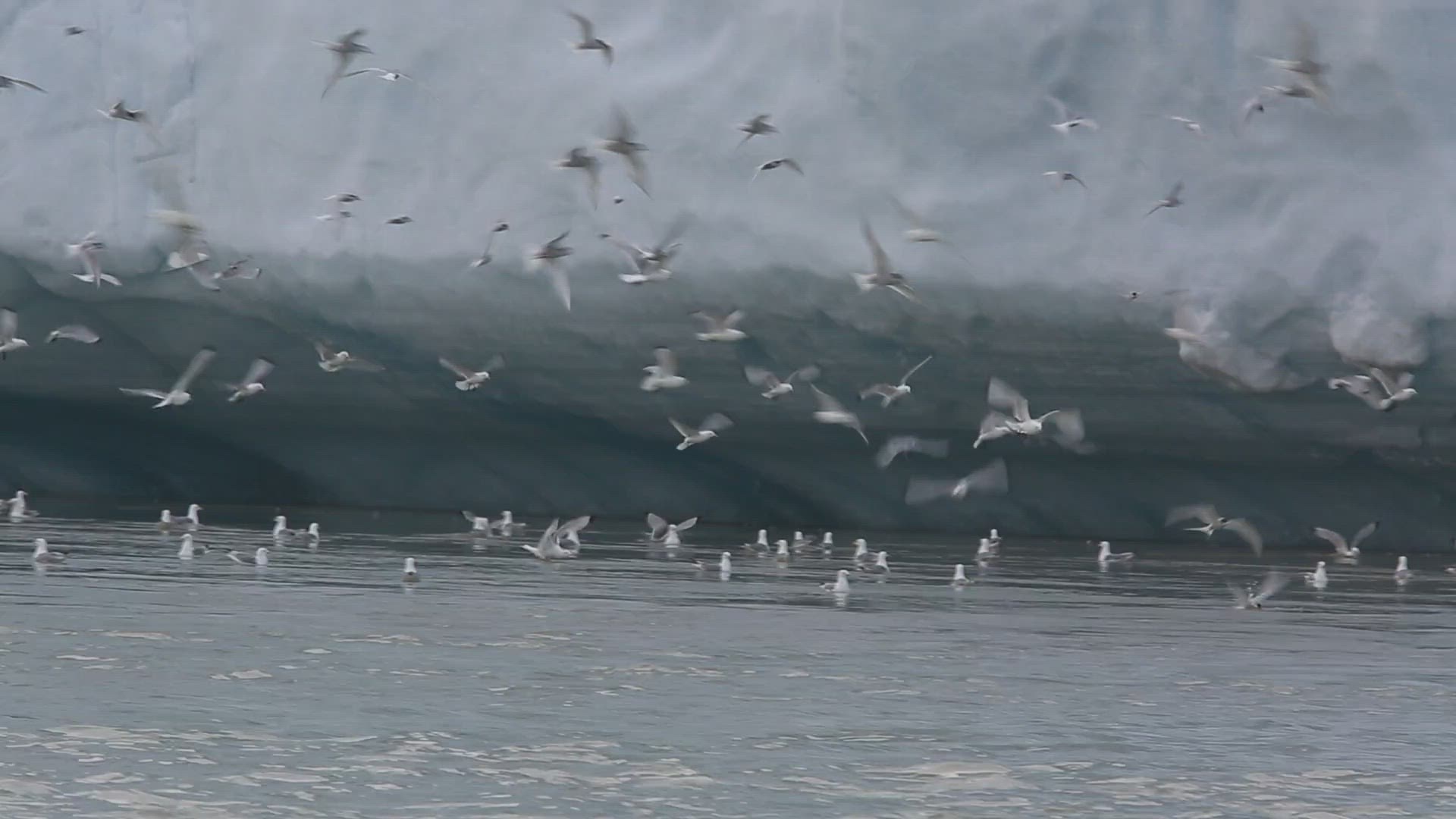 Large iceberg set against purple and orange sunset. Birds are seen flying in the distance.