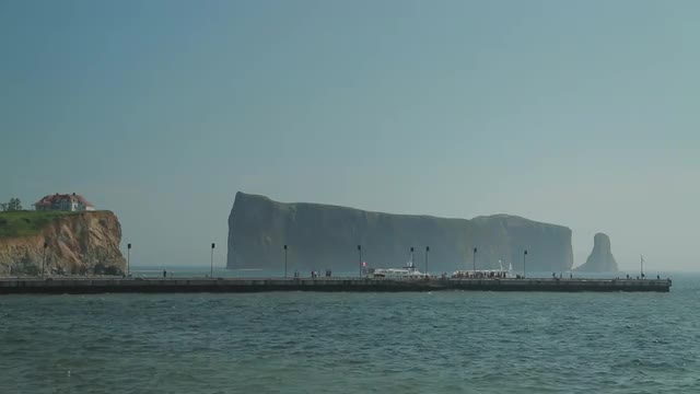 Static shot of a house atop cliffs of the Gaspé Peninsula adjacent to Bonaventure Island.