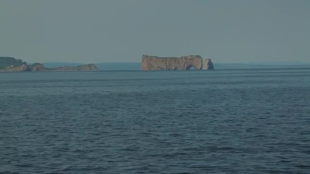 Long shot of Bonaventure Island shot from a ferry on the water.