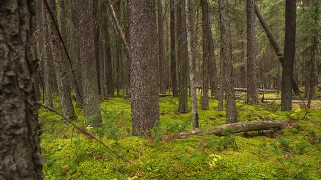 > Dolly right movement of trees in the forest
