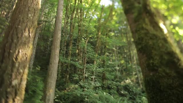 Time lapse motion dolly shot of trees and plants in the forest.