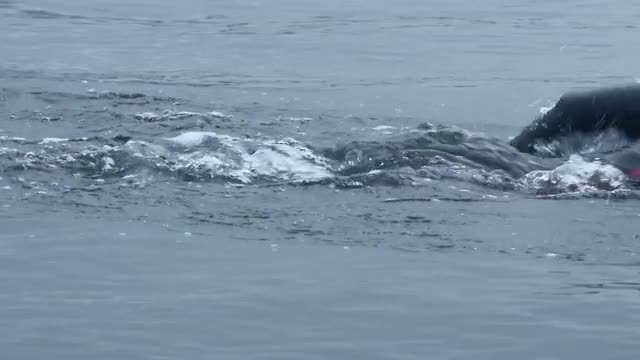 Closeup of a triathlete swimming in the cold waters of the ocean (slow motion).
