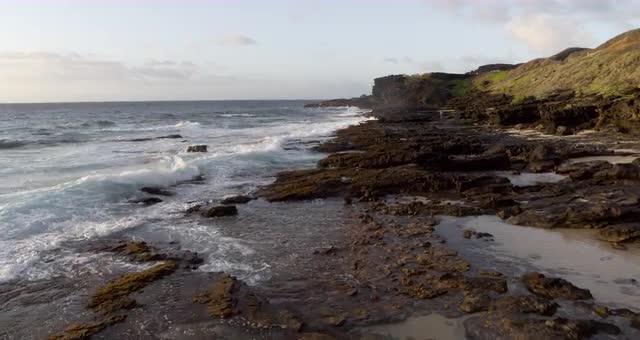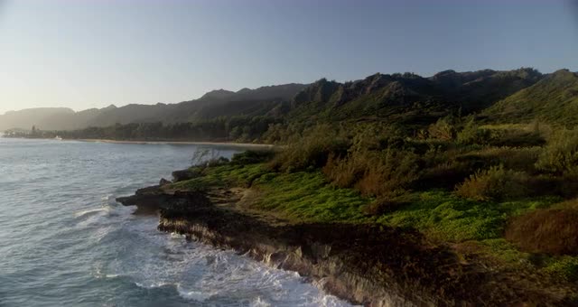 > LONG WIDE AERIAL SIDE POV past commercial and residential areas along beach of Far Rockaway, New Yor