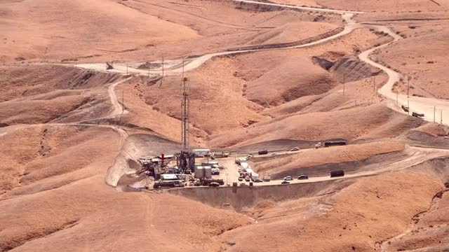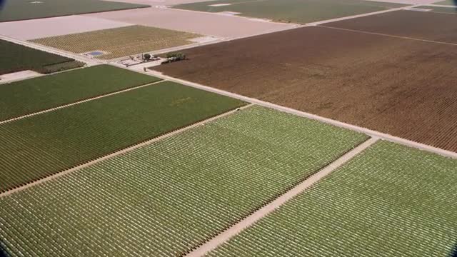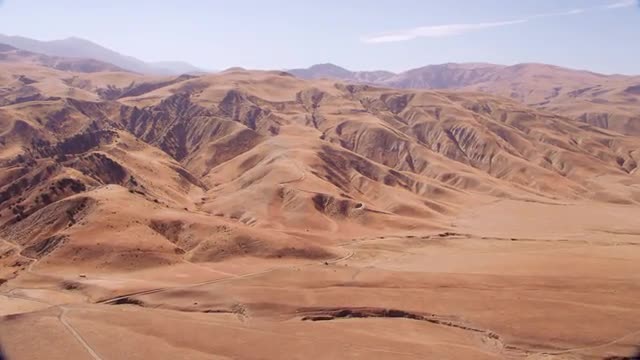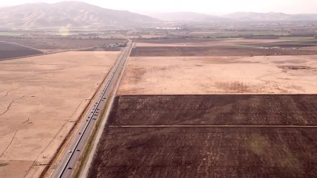 > AERIAL POV over desert mountain to LONG AERIAL traffic on highway, California