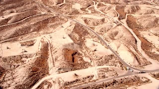WIDE AERIAL POV over barren desert mountains with roads running through, California