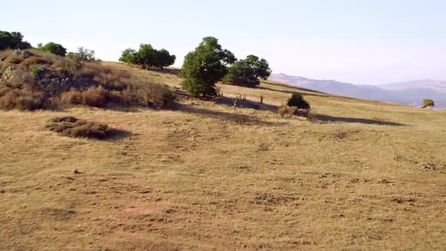 MEDIUM to LONG AERIAL POV over desert mountains with vegetation and trees to vast valley and mountai