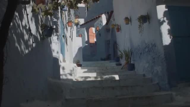 Upward tilt shot of an uphill alleyway in Chefchaouen, Morocco.