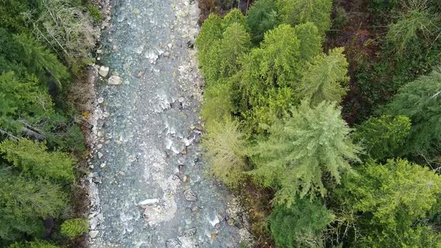 1129652 - Aerial top down view of river rapids surrounded by green spruce forest.