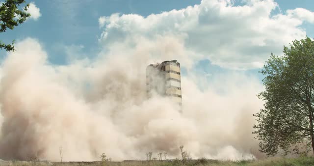 A former Philips building in Eindhoven is getting demolished by blowing it up, but due to a miscalculation it fails and part of the building survives the blast. Raw footage available