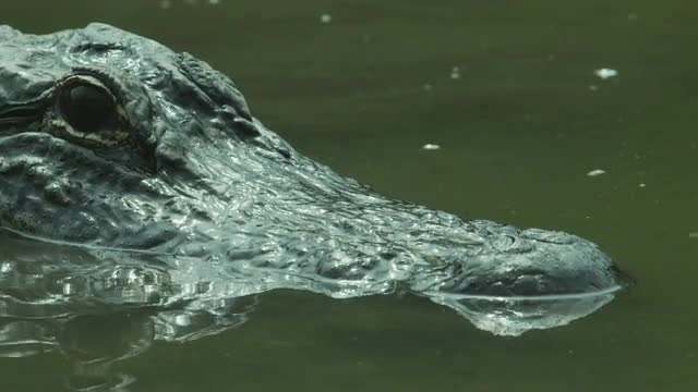 164988 - An alligator emerges from a swamp and touches the camera with its snout.