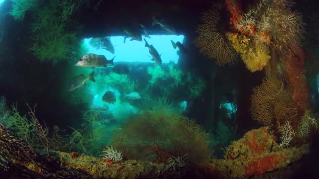 Underwater scene inside of a shipwreck with slow pan and many fish in the scene. Shot at 6k 60p and mastered to 4k 60p