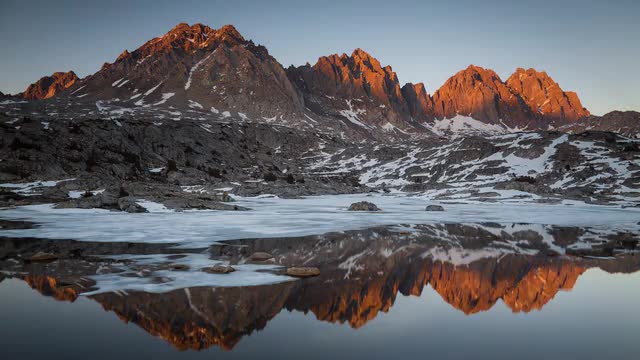 The 14,000' peaks of the Palisades region in the Sierra Nevada stand guard over Dusy Basin as the setting moon casts the alpine landscape in shadow. The Milky Way rises to the South and illuminates the granite with starlight. The calm waters reflect the entire scene while the motion control camera dollies 6 feet to the left while panning to track the center of our home galaxy.
