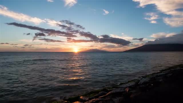Timelapse, sun rises as waves break on the shore and clouds drift overhead.