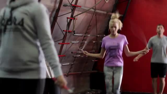> Young blond woman exercises with a jumping rope -Clip 1-