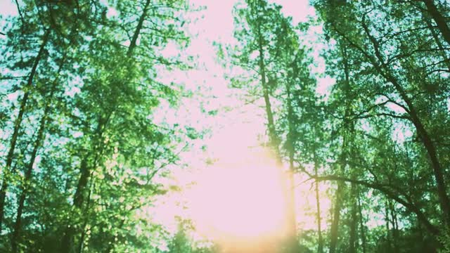 134009 - Pan across blades of grass looking up at trees in the forest_01