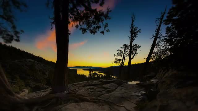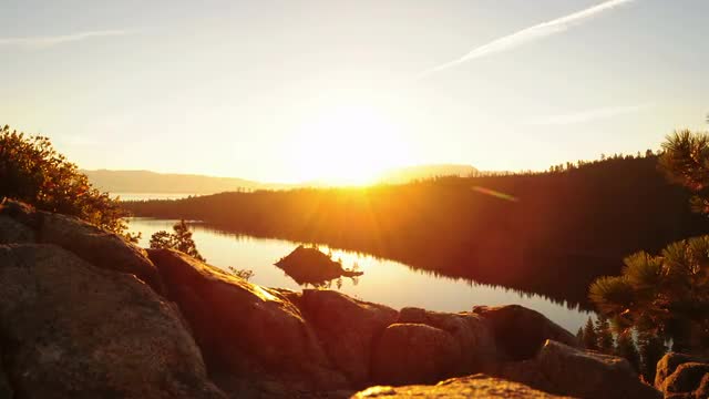 92165 - Timelapse tilting shot of the sunrise over a Emerald Bay in Nevada with lens flare