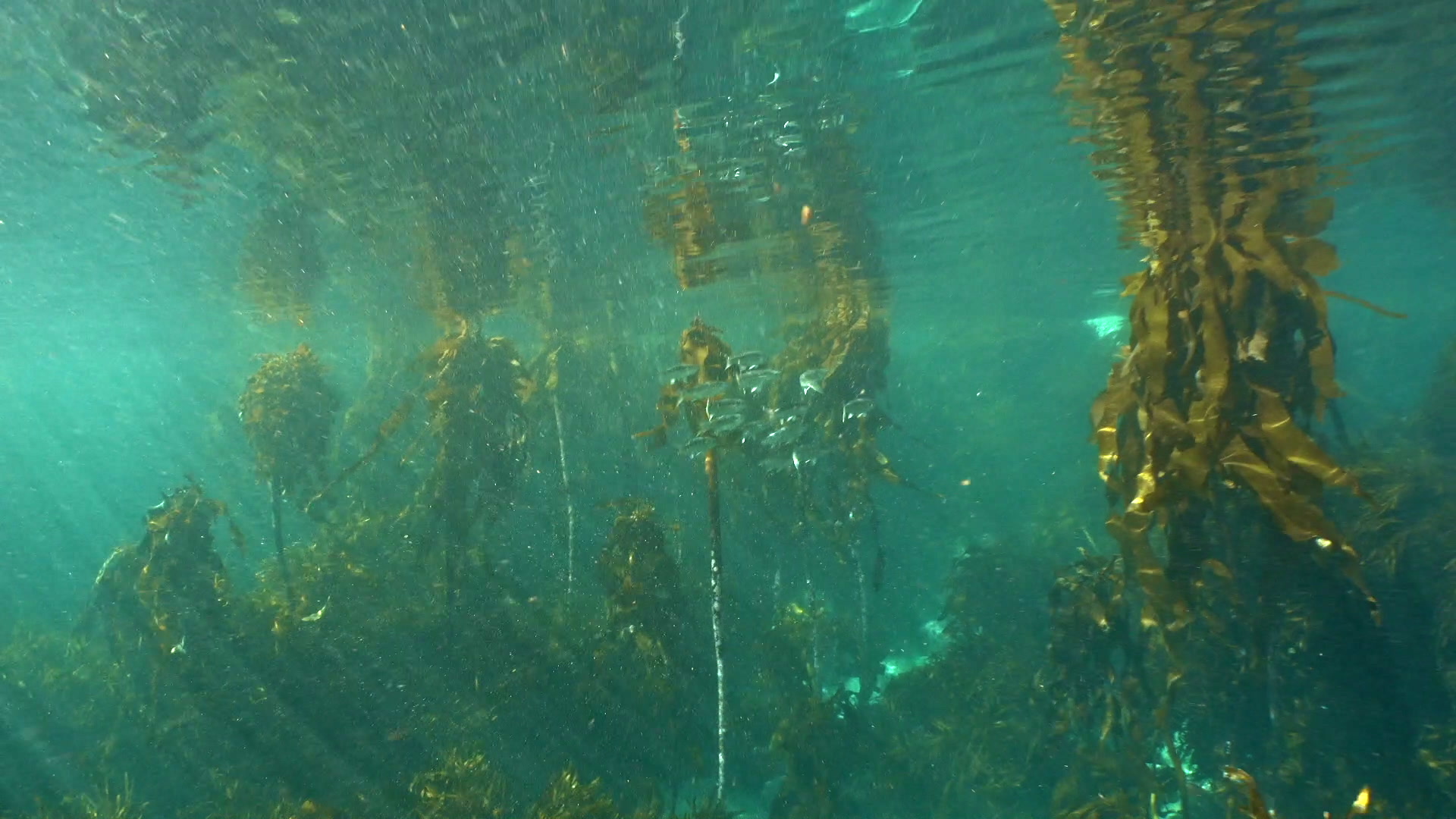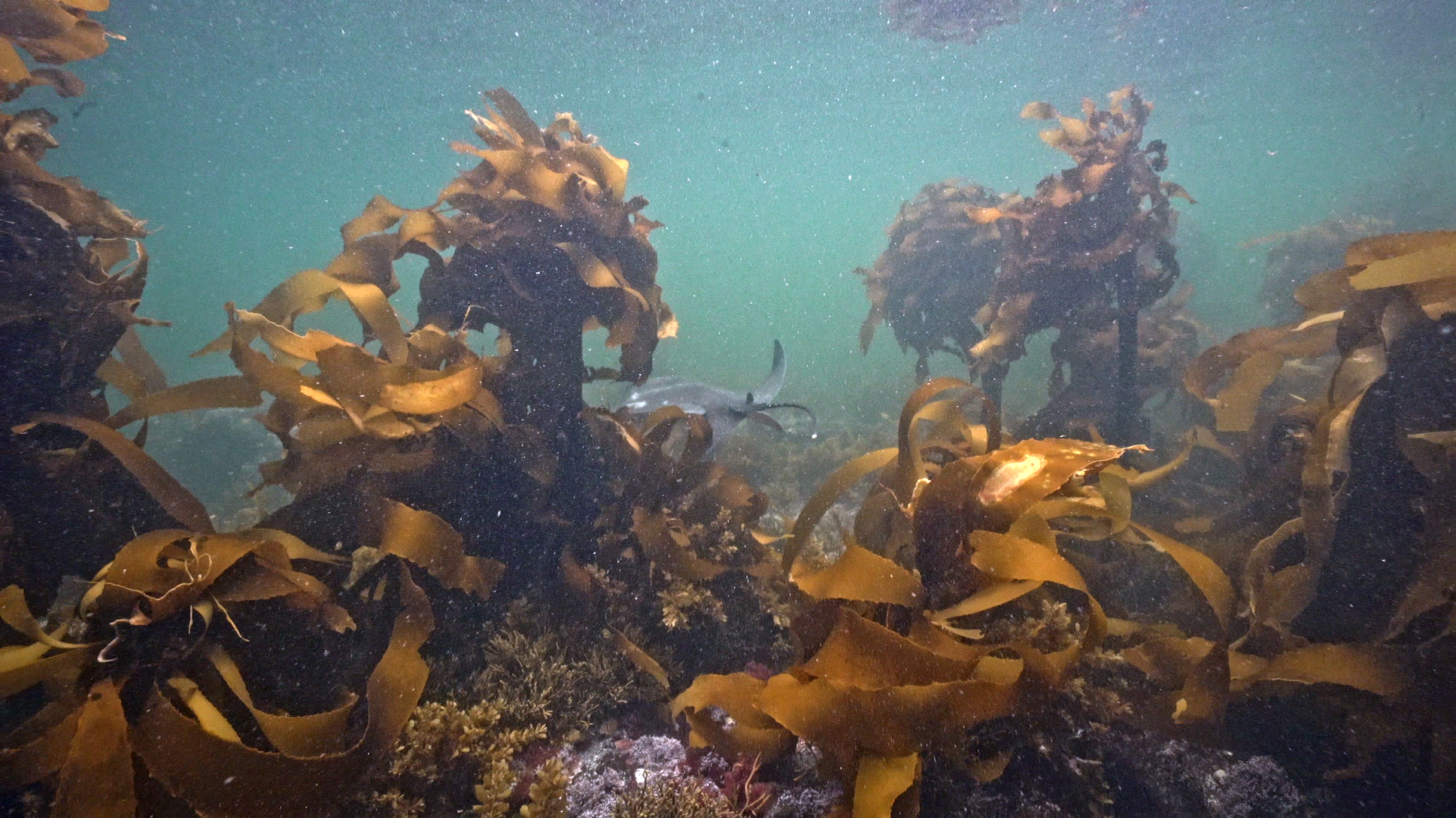 A sevengill cowshark in the kelp forests of False Bay, South Africa.