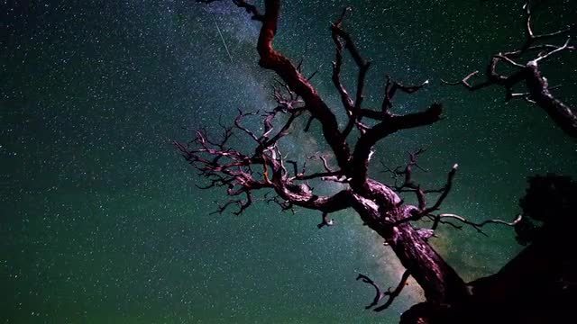 A vibrant milky way passes behind a dead tree in a remote area of Canyonlands National Park. Original 4K+ resolution file available upon request.