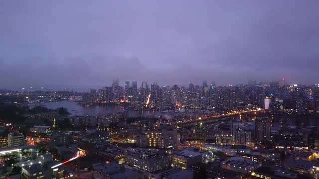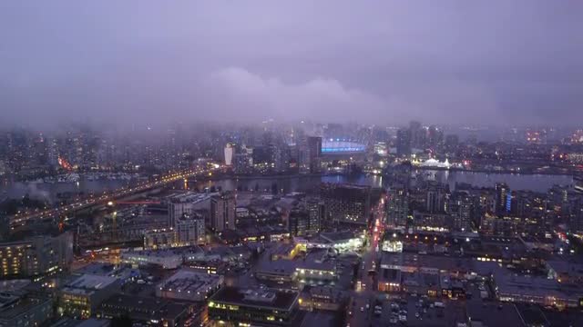 > Clouds and the purple sunset over North American city