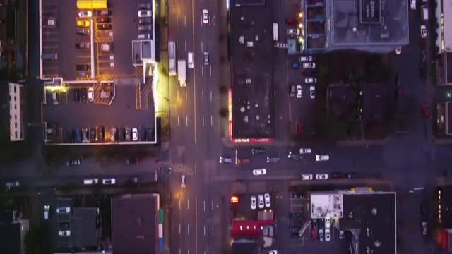 1361822 - Aerial view of Vancouver neighbourhood with some cars and downtown in the evening