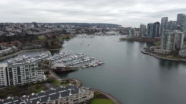 Aerial view of marina and buildings of Vancouver in overcast day