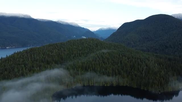 Wide shot of the hill covered with mountains and a little bit of morning fog with the lake and river around