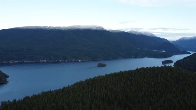 > Fly over green pine forest towards the mountains with the calm morning river