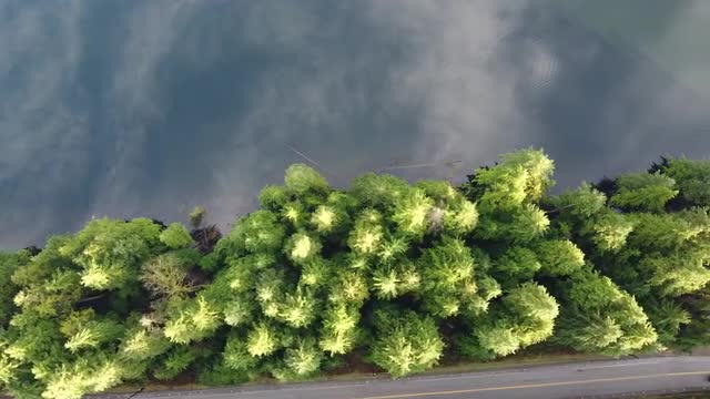 Top down view of the mirror-like lake with the clouds reflection and surrounding green forest. Lonely road with the car