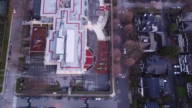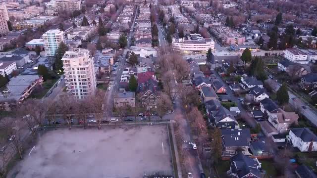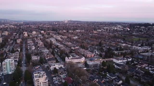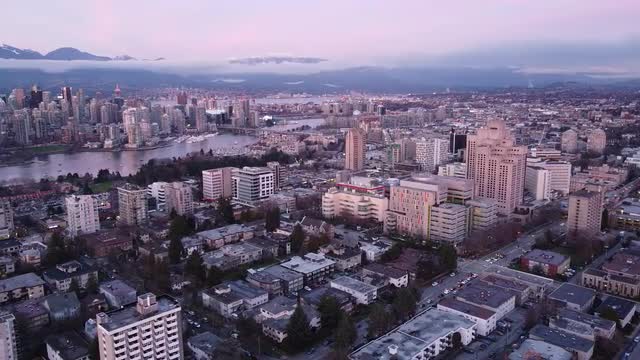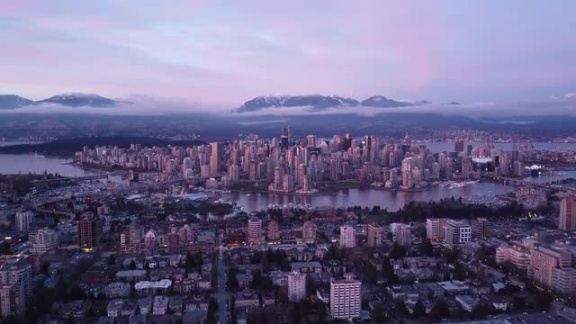 Aerial view of Vancouver downtown during amazing purple sunset