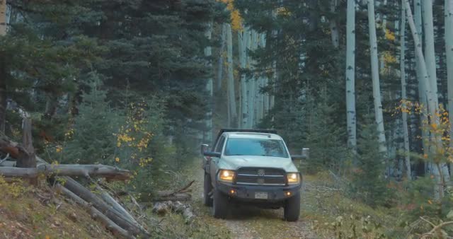 > Truck drives over Aspen forest road, wide follow
