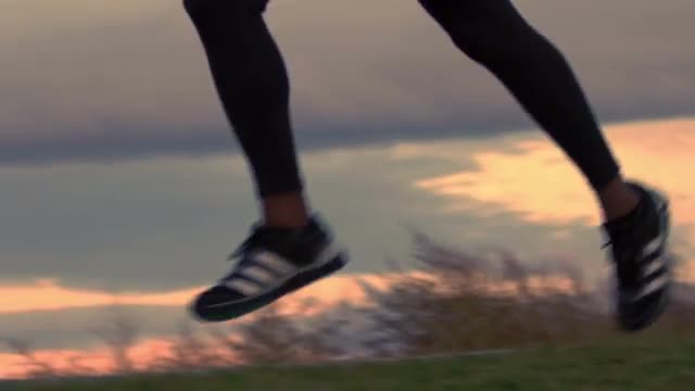 > Man running across frame in nature at sunset