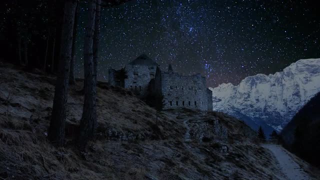 A star-filled sky and soft clouds move over snowy mountains and the ocean in Northern Norway Fjords