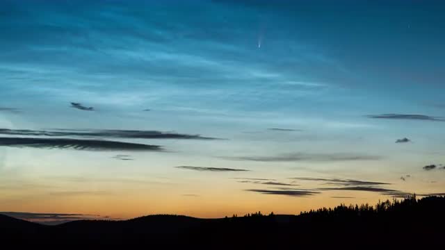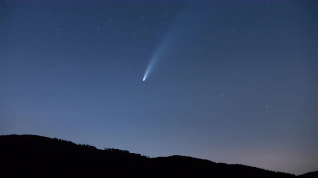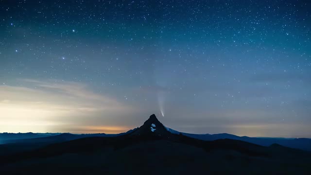 Timelapse of comet Neowise setting through the starry night sky as it reflects off of Sparks Lake over Broken Top and South Sister in the Cascades of Central Oregon.