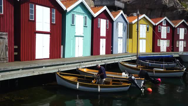 1117179 - man standing in small fishing boat at jetty in Smögen, Sweden