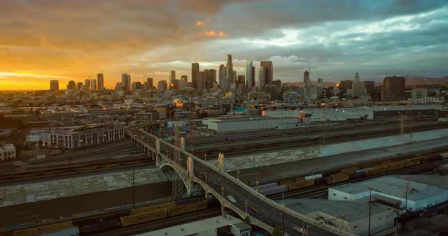 > Hyperlapse aerial of downtown Los Angeles at dusk