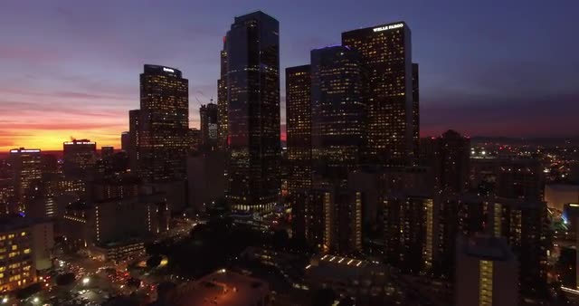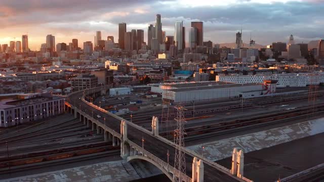 Hyperlapse aerial of downtown Los Angeles at dusk