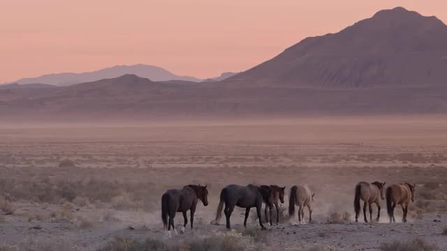 Wild mustangs moving through the desert at dusk in Utah