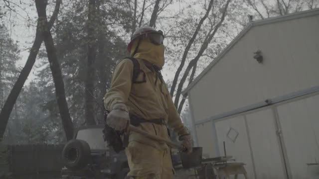 > Wildfire burning on mountainside as firefighter works the boarder