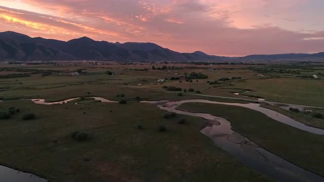 1091321 - Flying over winding river during colorful sunrise in Star Valley viewing Afton
