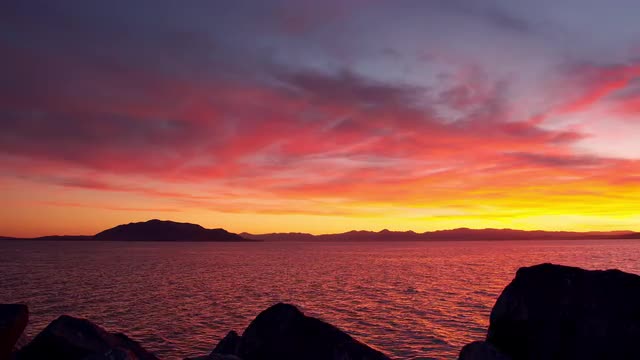 Colors reflecting from vibrant sunset over Utah Lake looking past rocks on the shore at Provo Harbor.