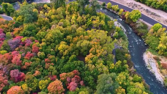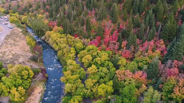 > Flying over colorful trees towards rocky cliffs and Upper Falls in Provo Canyon
